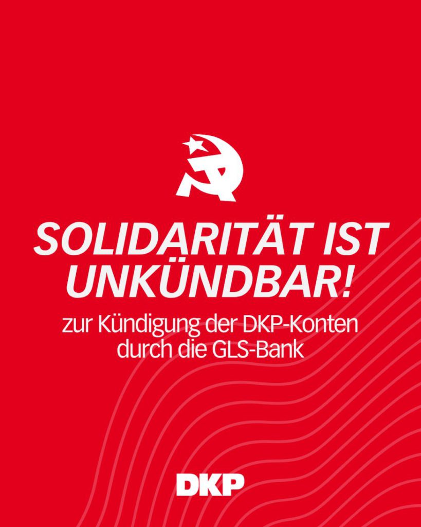 Die GLS-Bank hat zum 31. Dezember die Konten des Parteivorstands der Deutschen Kommunistischen Partei (DKP) sowie zahlreicher Gliederungen gekündigt. Vorgeschoben werden die Allgemeinen Geschäftsbedingungen (AGB) und die darin enthaltene Klausel zur Kündigung ohne Angabe von Gründen. Die DKP protestiert scharf gegen dieses offensichtlich politisch motivierte Vorgehen.
